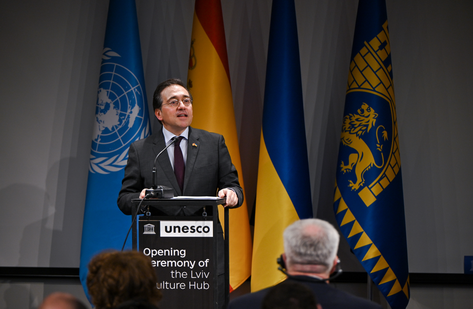 El ministro de Asuntos Exteriores, Unión Europea y Cooperación, José Manuel Albares, y la directora general de la UNESCO, Audrey Azoulay, inauguraron ayer el hub cultural creado gracias al Fondo Fiduciario España-UNESCO de Cooperación para el Desarrollo.